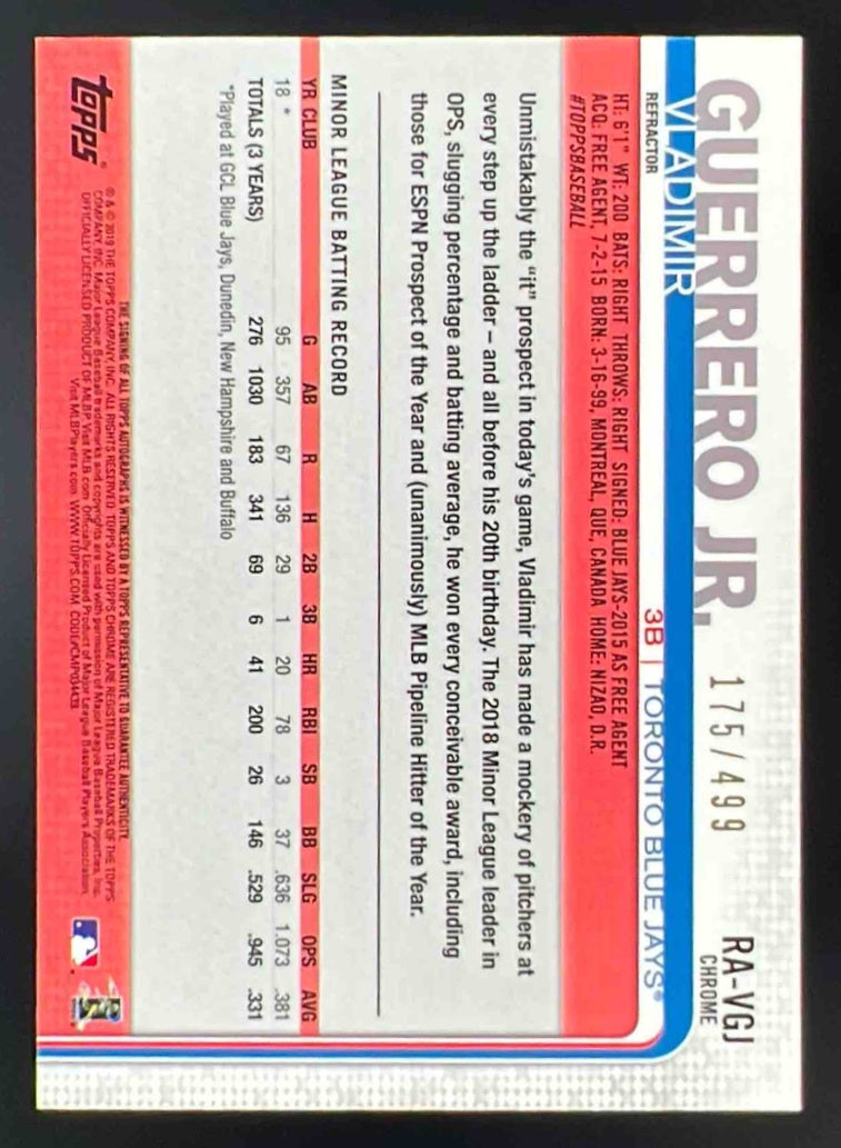 2019 Topps Chrome Rookie Refractor #RA-VGJ Vladimir Guerrero Jr. RC Auto /499
