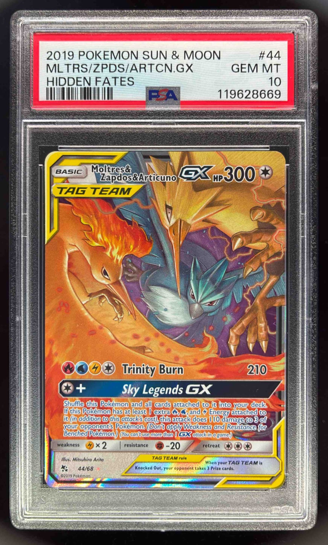 2019 Pokemon SM Hidden Fates #44 Moltres & Zapdos & Articuno Tag Team GX PSA 10