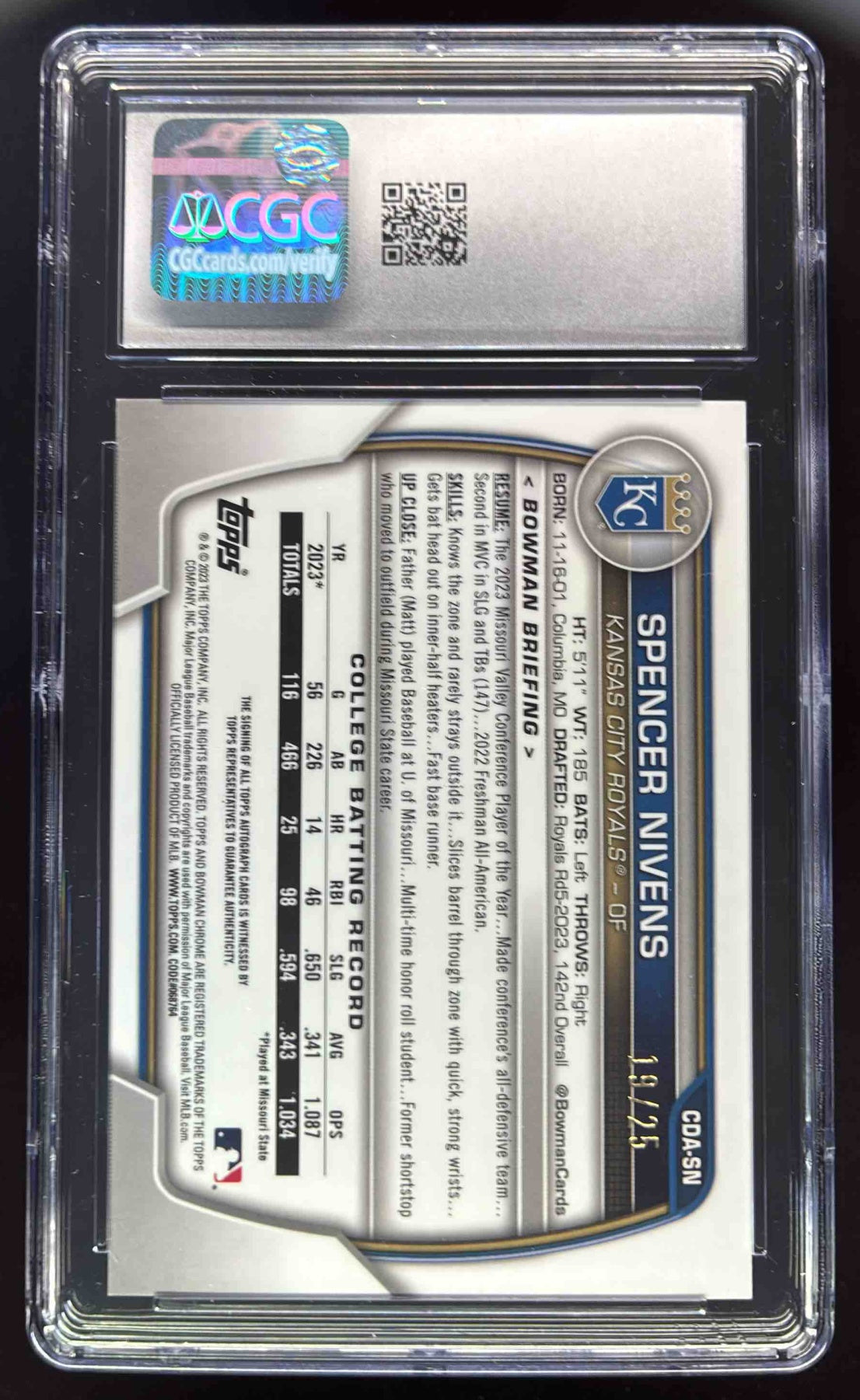 2023 Bowman Draft Chrome Orange Wave #CDA-SN Spencer Nivens RC Auto /25 CGC 10