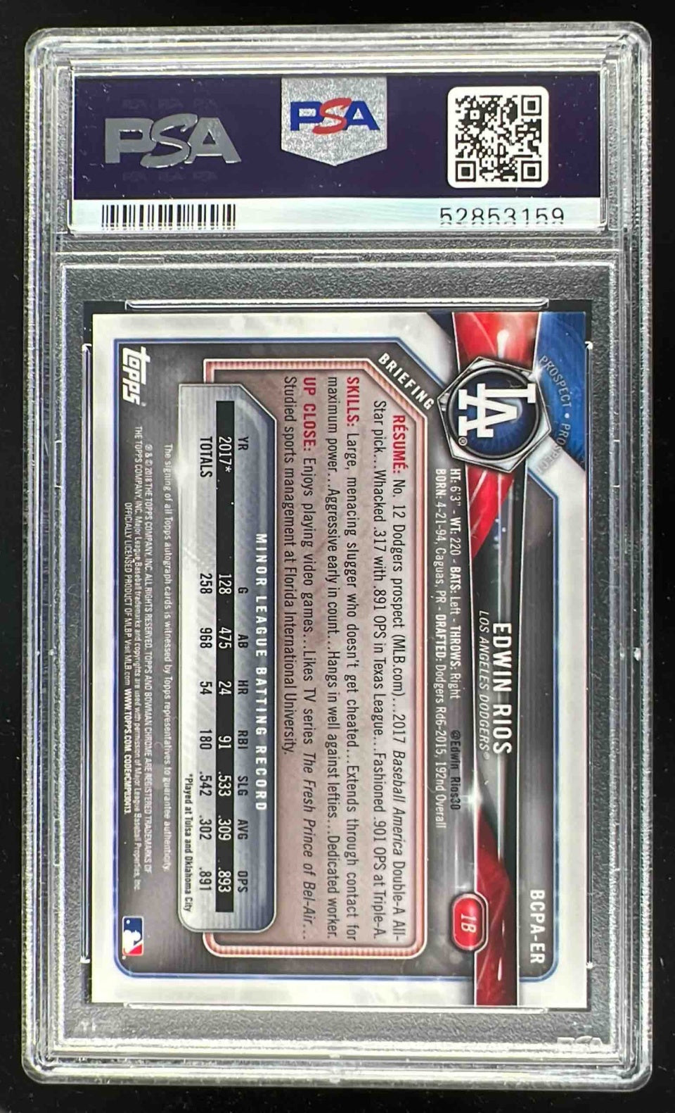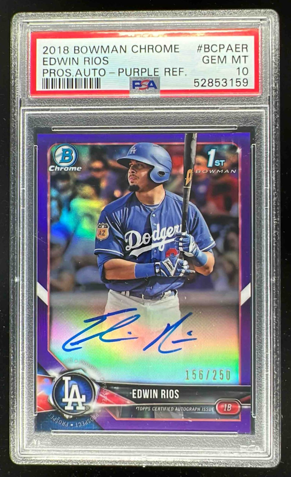 2018 Bowman Chrome Prospects Purple Refractor #ER Edwin Rios Auto /250 PSA 10