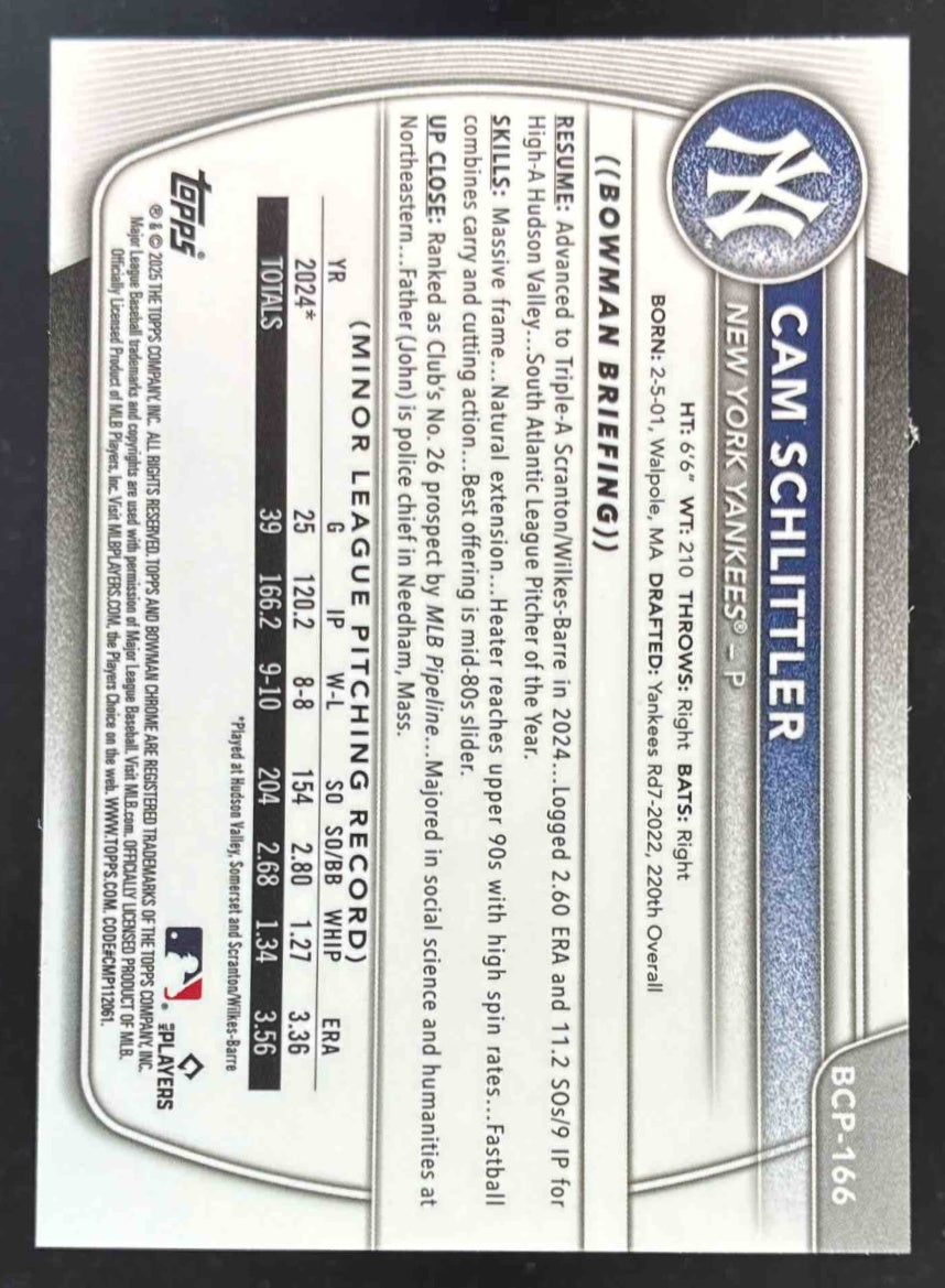 2025 Bowman Chrome Chrome Prospects #BCP-166 Cam Schlittler RC