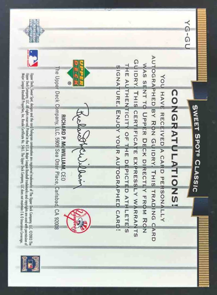 2003 Upper Deck Sweet Spot Classic Yankee Greats Black Ink Ron Guidry Auto /100