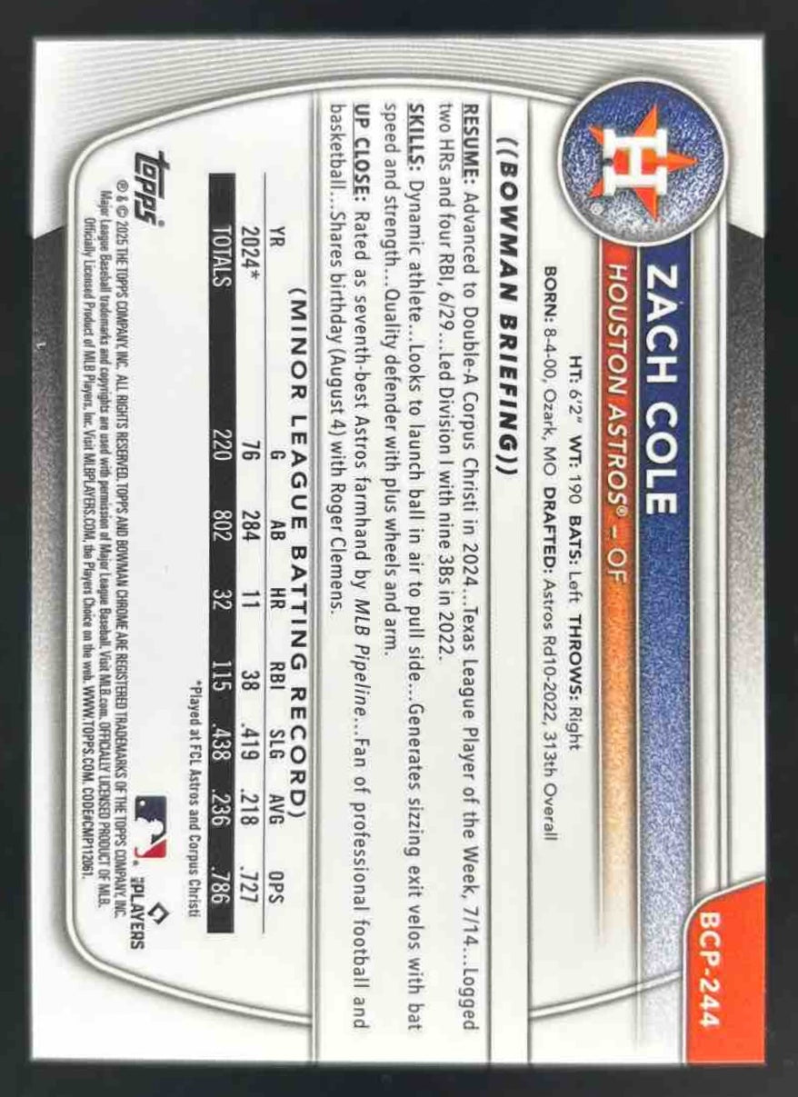 2025 Bowman Chrome Prospects Reptilian Blue Refractor #BCP-244 Zach Cole RC /150
