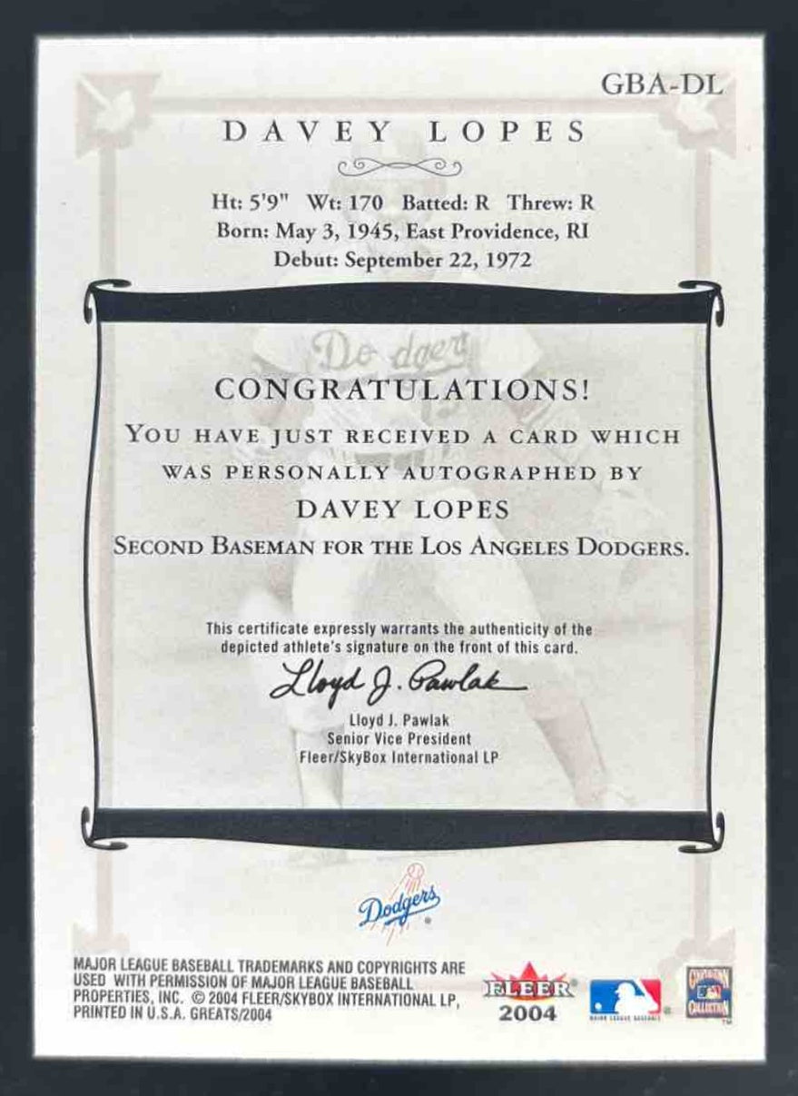 2004 Fleer Greats of the Game Autographs #GBA-DL Davey Lopes Auto