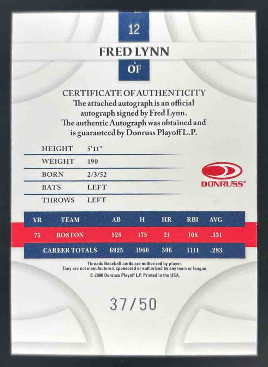 2008 Donruss Threads Signatures Gold #12 Fred Lynn Auto /50