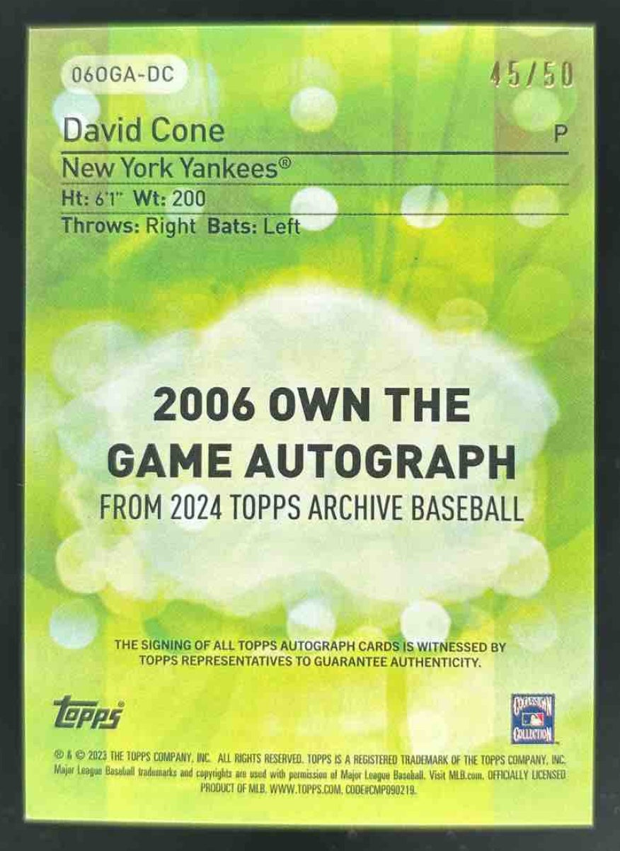 2024 Topps Archives 2006 Own the Game Gold Foilboard #DC David Cone Auto /50