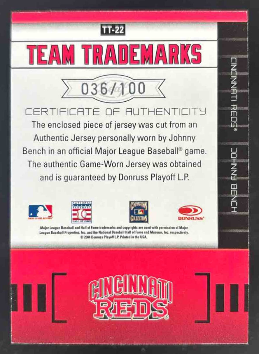 2004 Leaf Limited Team Trademarks Jersey Number #TT-22 Johnny Bench /100
