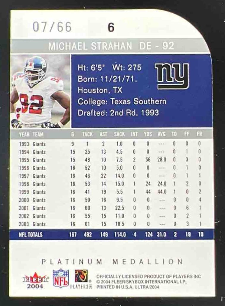 2004 Fleer Ultra Platinum Medallion #6 Michael Strahan /66