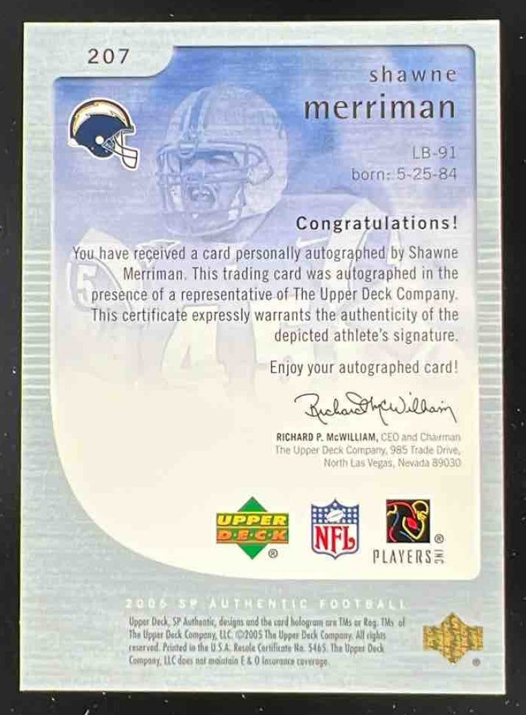 2005 SP Authentic #207 Shawne Merriman RC Auto /850