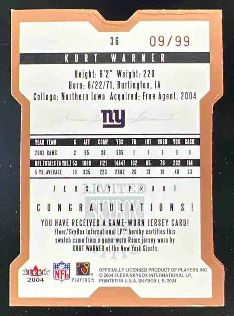 2004 Skybox LE Jersey Copper #36 Kurt Warner /99