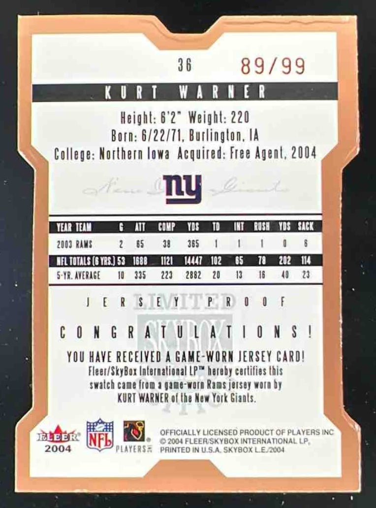 2004 Skybox LE Jersey Copper #36 Kurt Warner /99