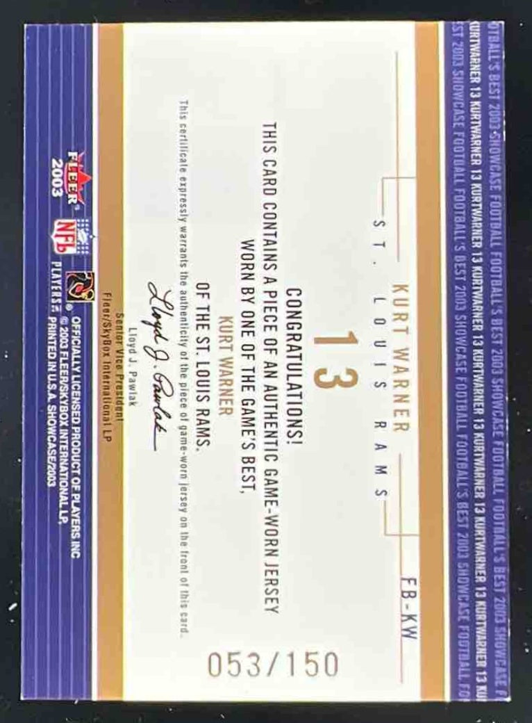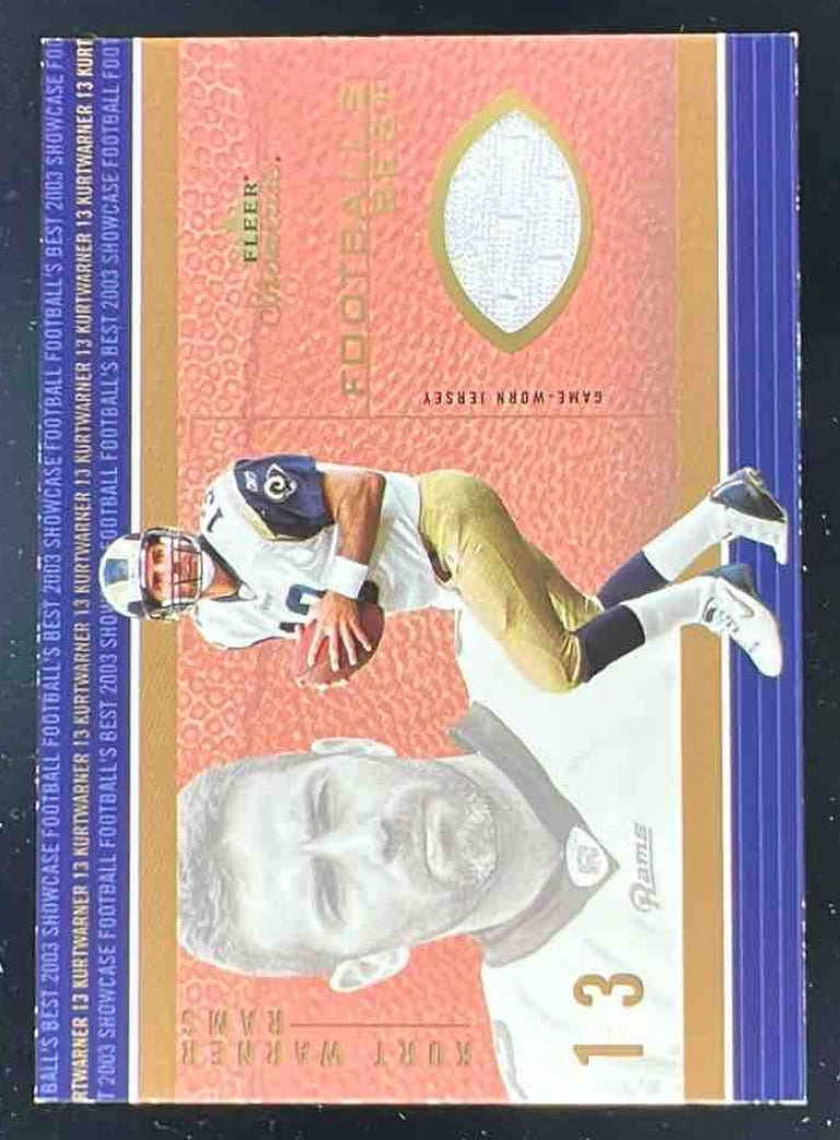 2003 Fleer Showcase Football's Best Jerseys Gold #FB-KW Kurt Warner /150