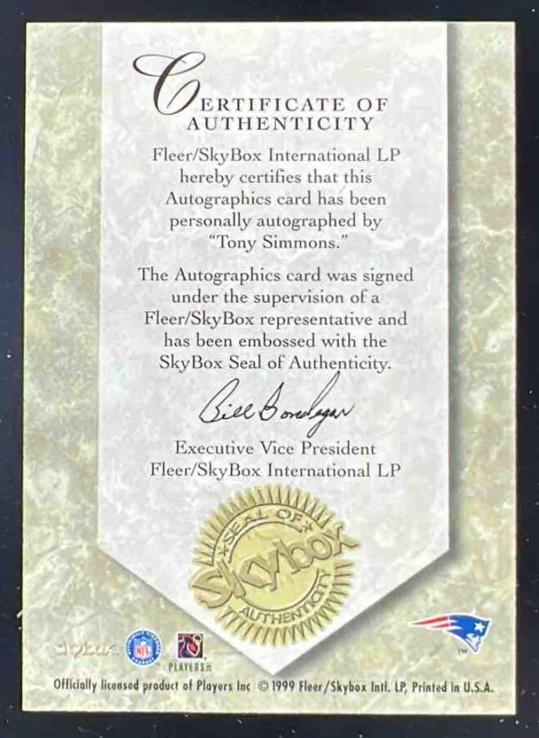 1999 Skybox Premium Autographics Red Foil #NNO Tony Simmons Auto /50