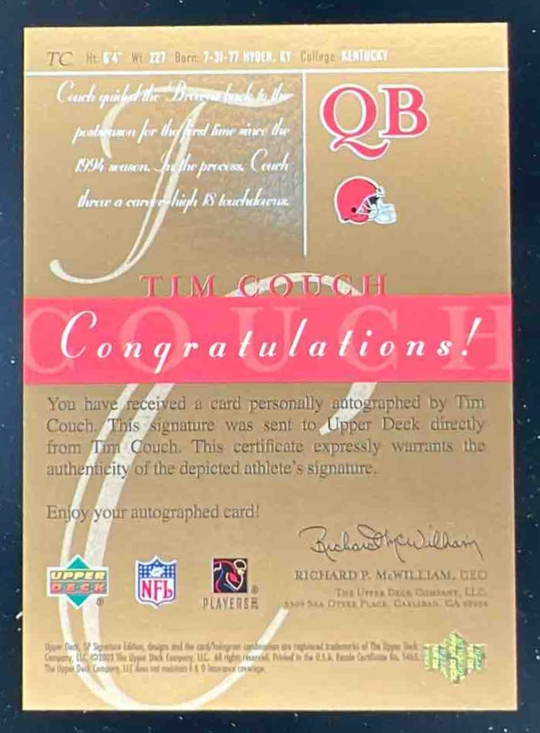 2003 SP Signature Edition Autographs Red Ink #TC Tim Couch Auto /100