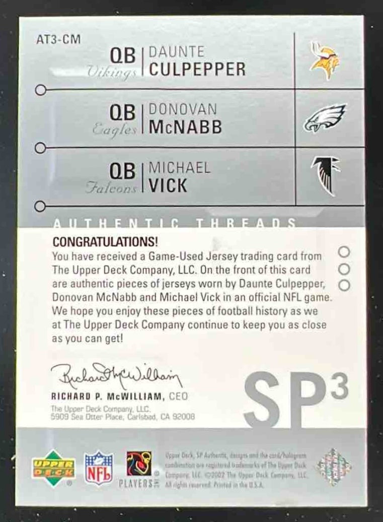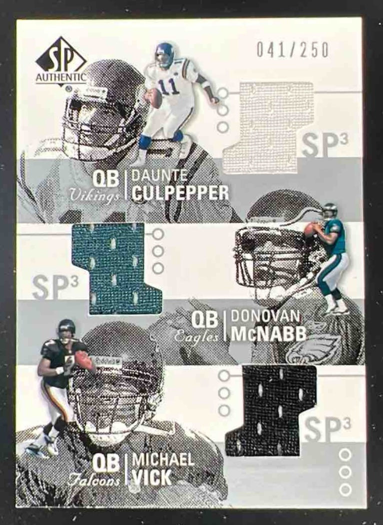 2002 SP Authentic Threads Triple Culpepper Donovan McNabb Michael Vick /250