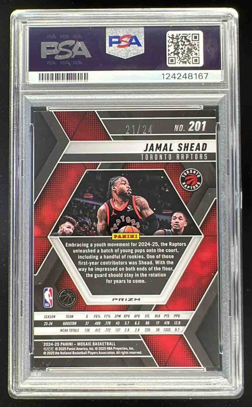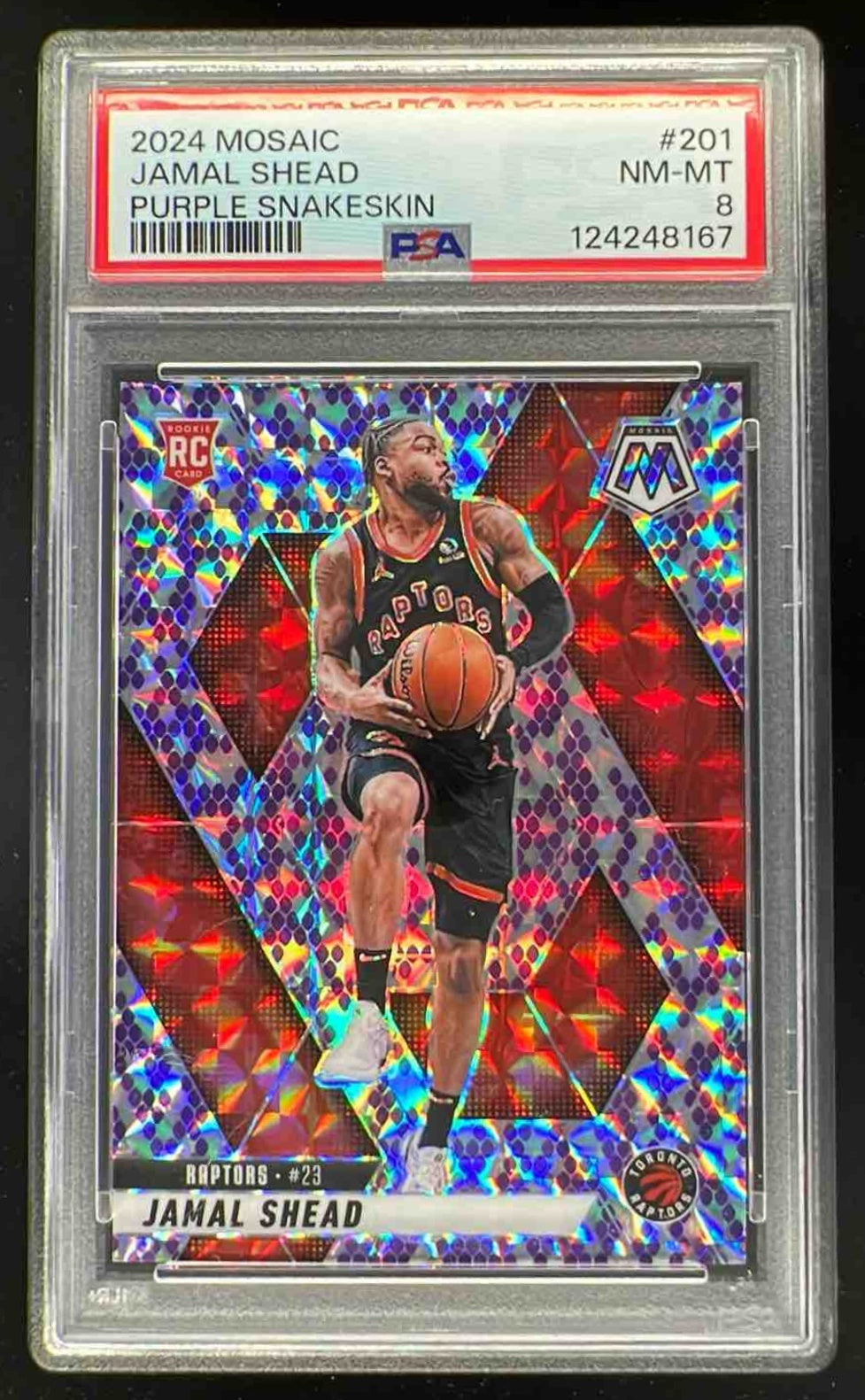 2024-25 Panini Mosaic Purple Snakeskin Mosaic #201 Jamal Shead RC /24 PSA 8
