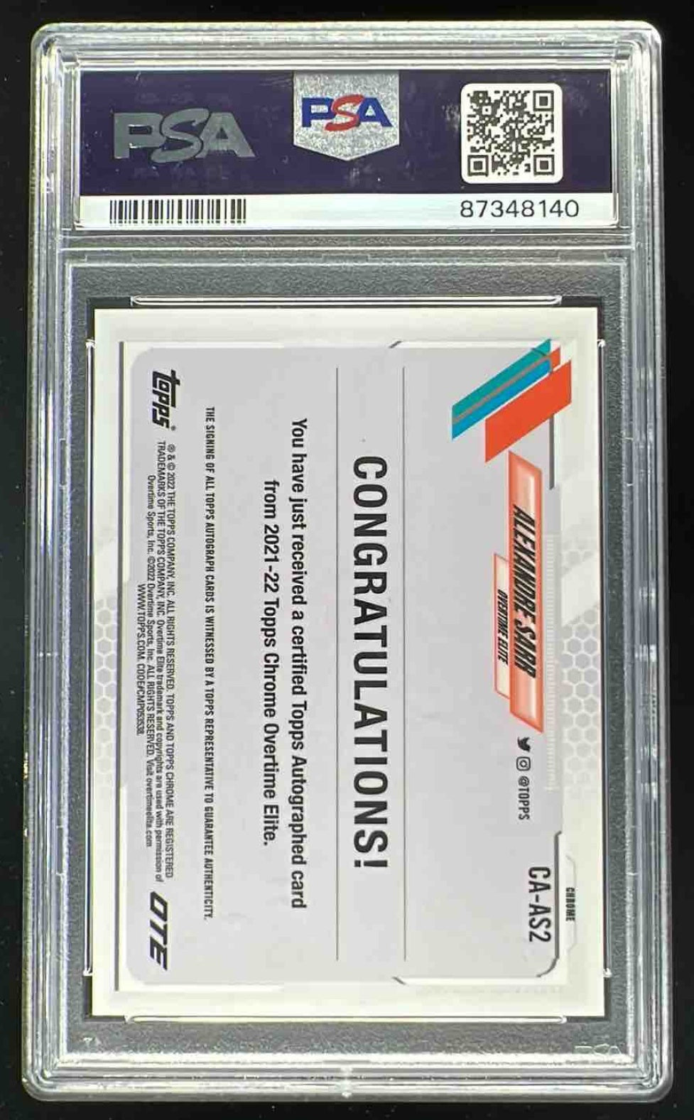 2021-22 Topps Chrome Overtime Elite Autograph #CA-AS2 Alexandre Sarr Auto PSA 10