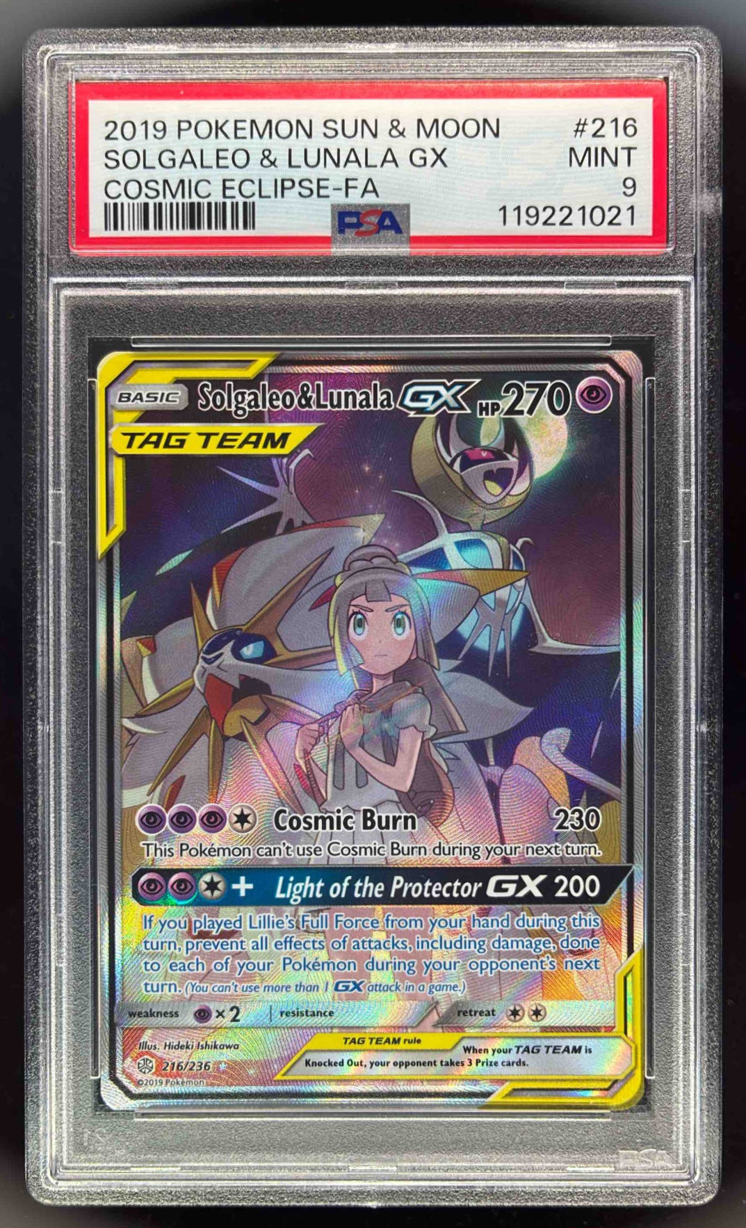 2019 Pokemon Sun & Moon Cosmic Eclipse #216/236 Solgaleo & Lunala Tag Team PSA 9