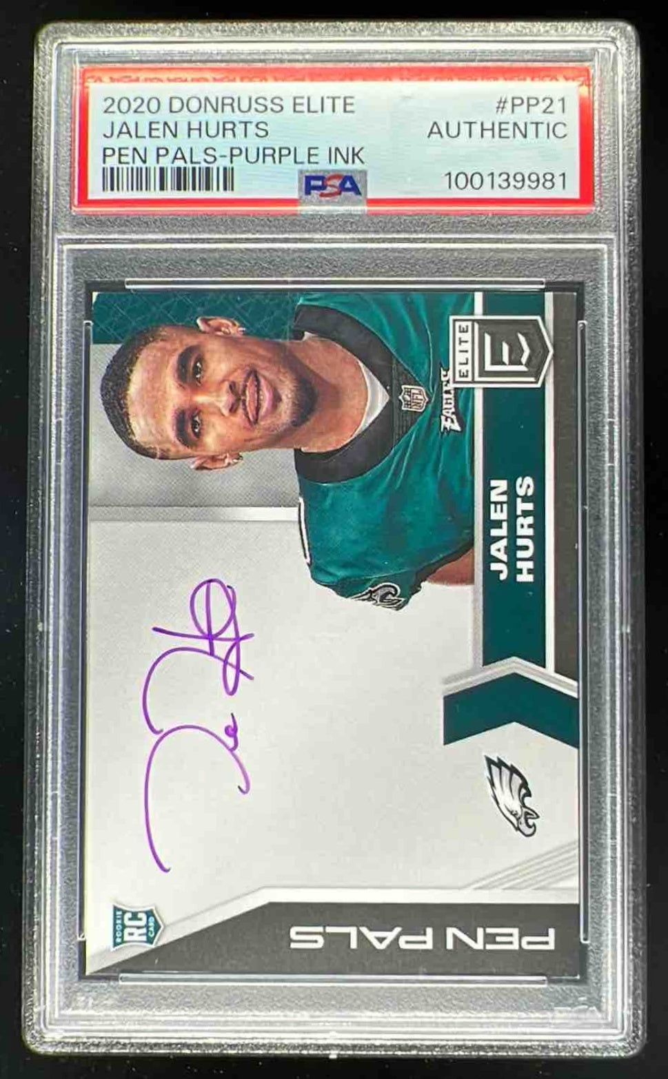 2020 Donruss Elite Pen Pals Purple Ink #PP21 Jalen Hurts RC Auto PSA Authentic