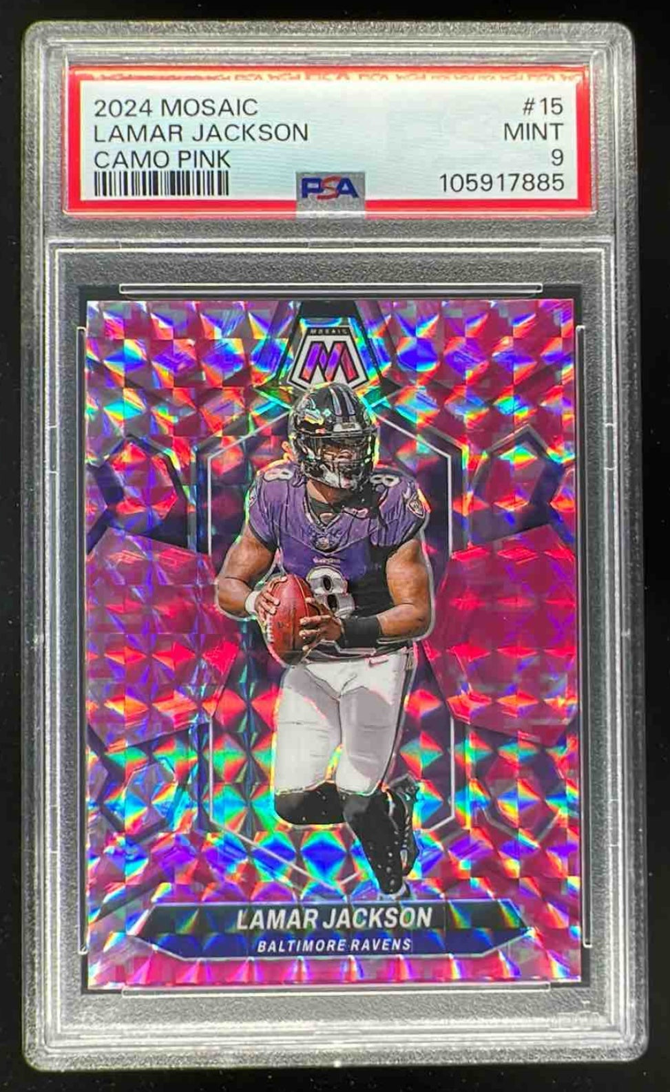 2024 Panini Mosaic Camo Pink Prizm #15 Lamar Jackson PSA 9
