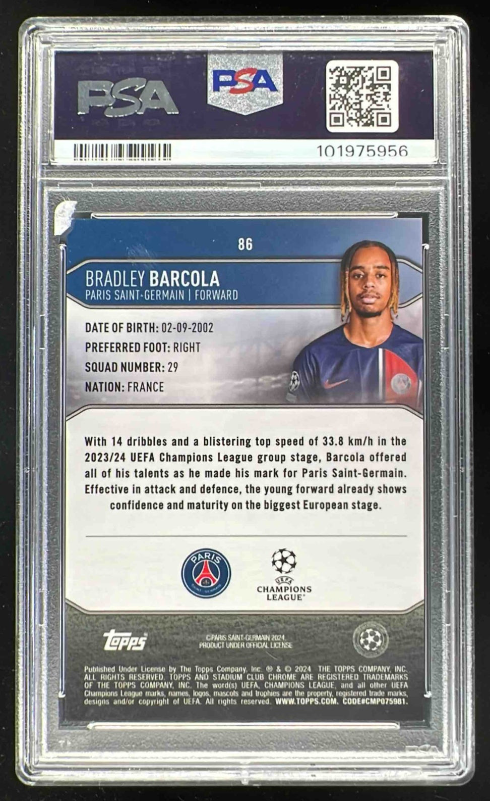 2023 Topps Stadium Club Chrome UEFA Members Only #86 Bradley Barcola RC PSA 10