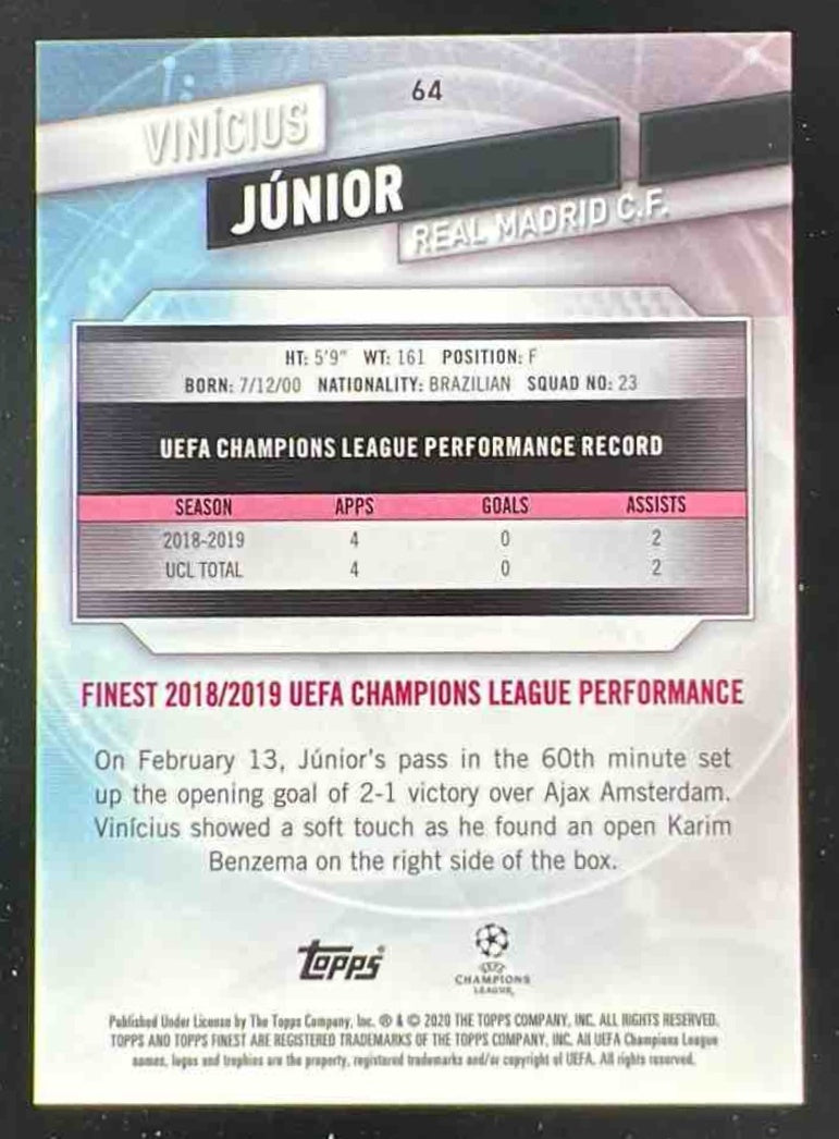 2019 Topps Finest UEFA Champions League Blue #64 Vinicius Junior /150
