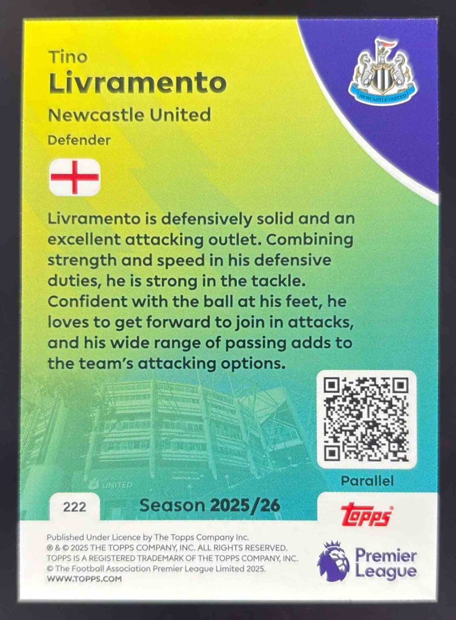 2025-26 Topps Premier League Orange Rainbow Foil #222 Tino Livramento /25