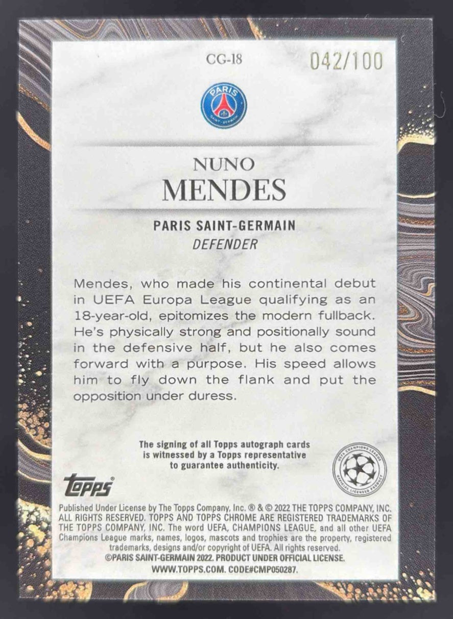 2021 Topps Chrome UEFA League Chasing Glory #CG-18 Nuno Mendes Auto /100