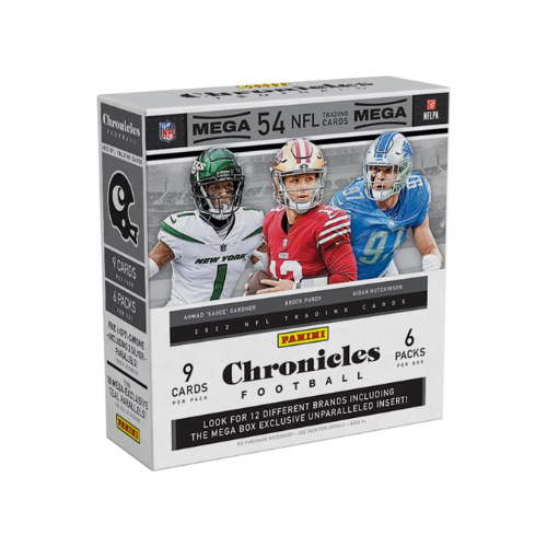Unlock a world of football cards with the 2022 Panini Chronicles Football Mega Box! With an average of 6 Opti-Chrome cards per box featuring two Silver Parallels, and 10 Mega Exclusive Teal Parallels, this box promises the ultimate collecting experience. Explore up to12 different brands with one thrilling Mega Box exclusive unparalleled insert! Don't miss out on this chance to own your own incredible collection of cards!