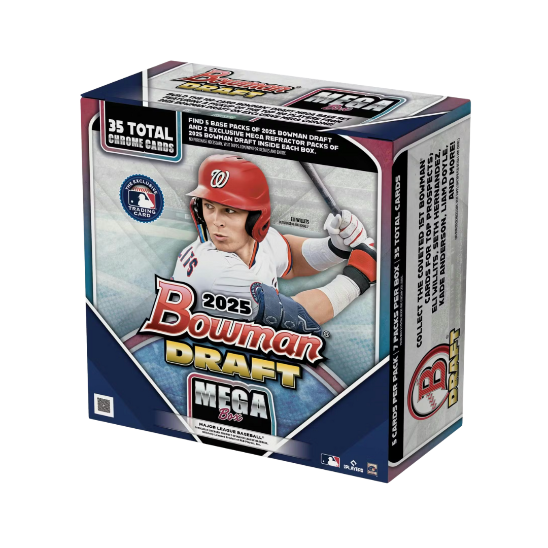 - 2025 Bowman Draft Mega Box makes its debut featuring the top-100 Chrome Prospect cards from 2025 Bowman Draft Baseball on exclusive Mega Chrome pattern!