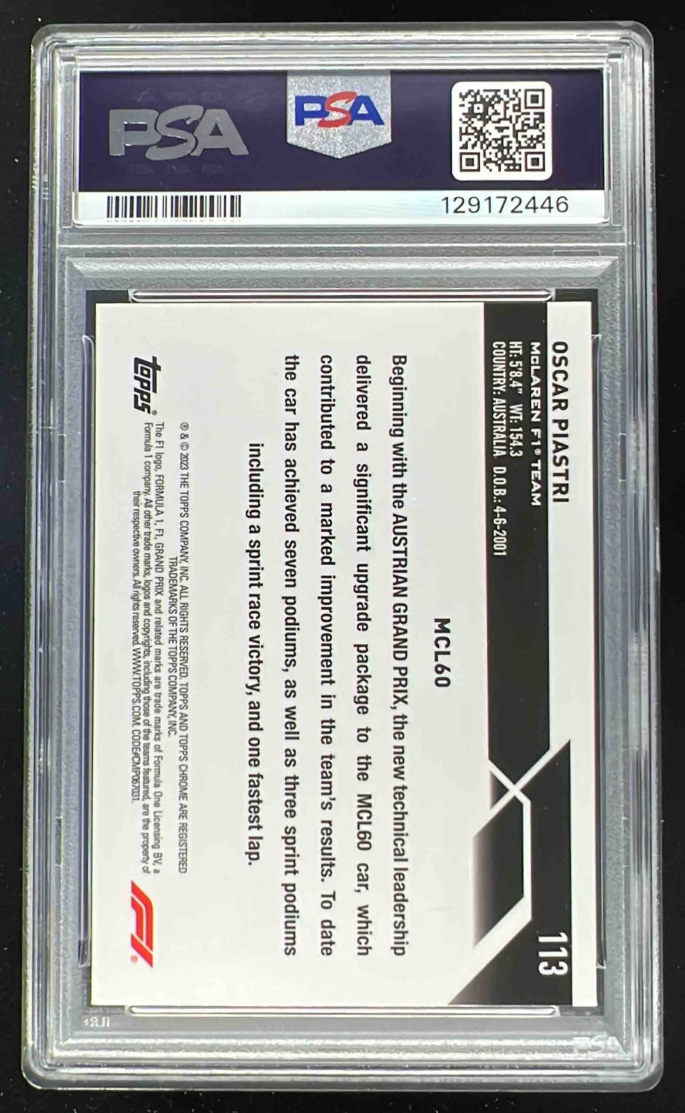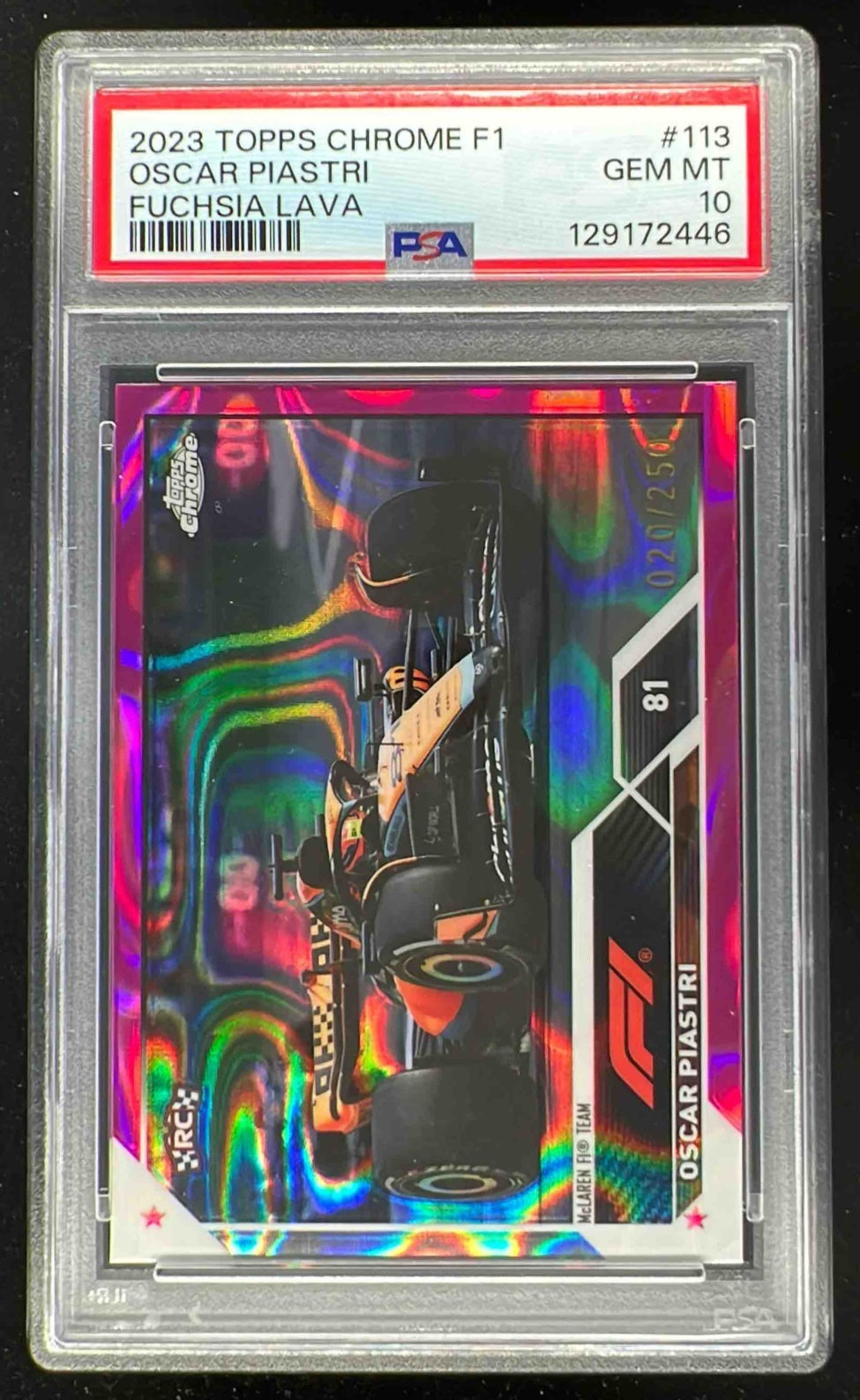 2023 Topps Chrome Formula 1 Fuchsia Lava Refractor Oscar Piastri RC /250 PSA 10