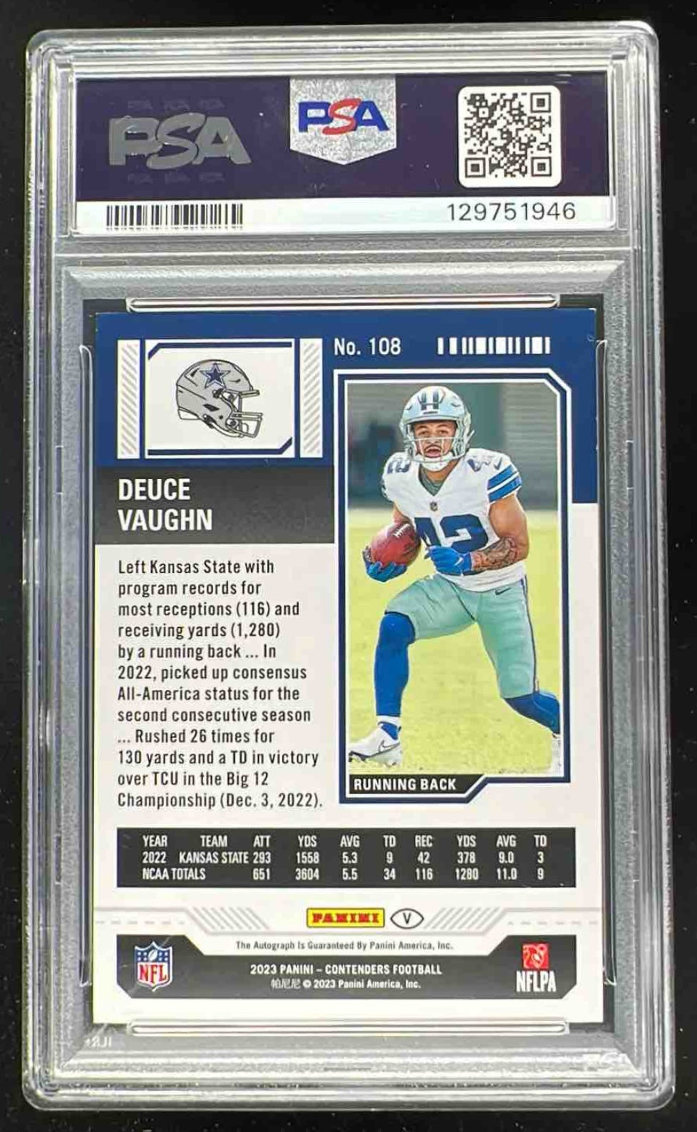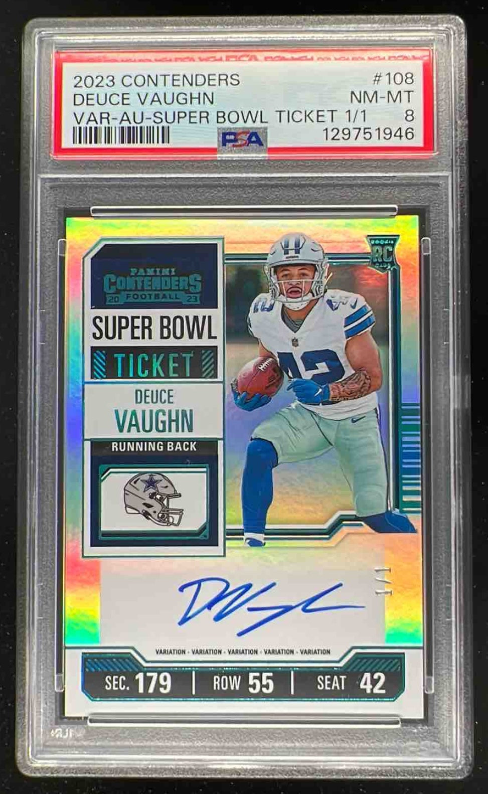 2023 Contenders Optic Super Bowl Ticket #108b Deuce Vaughn RC Auto 1/1 PSA 8
