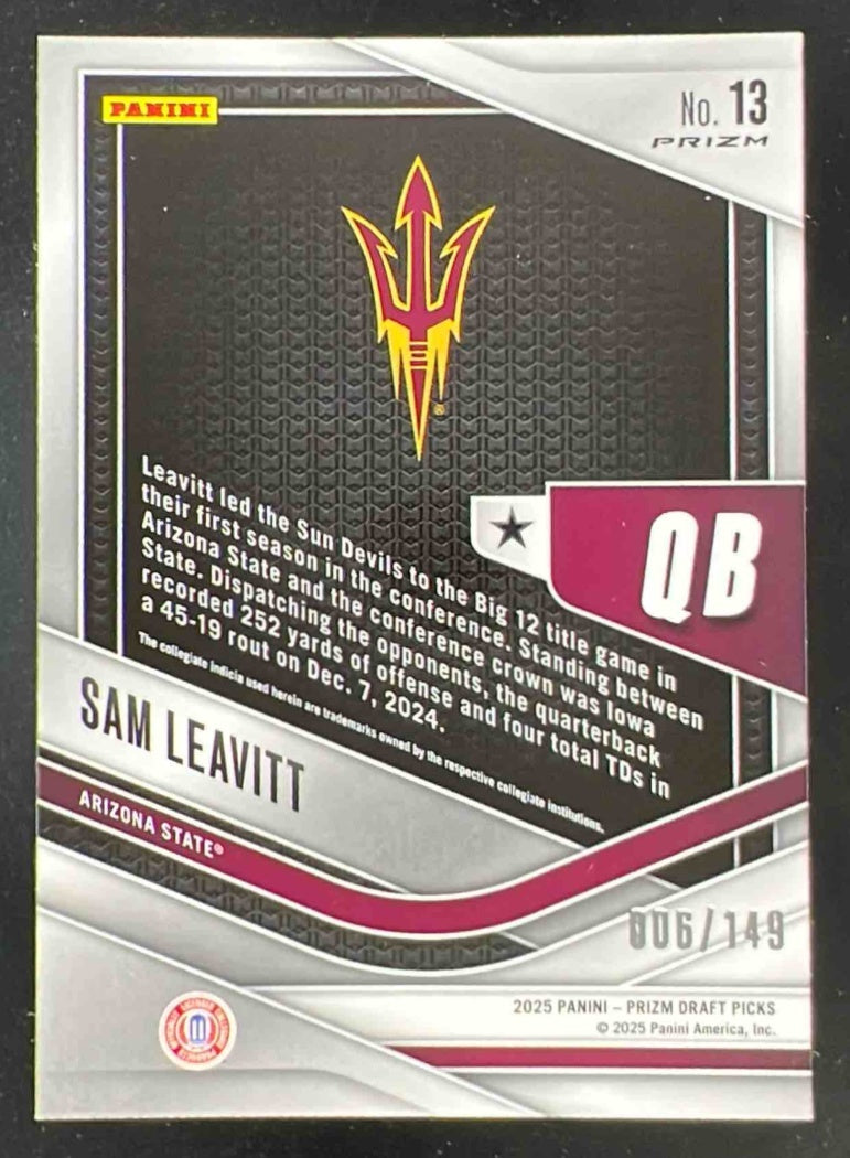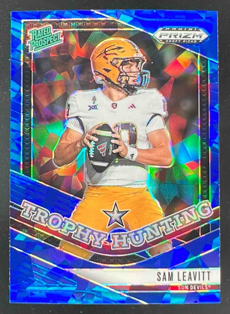 2025 Panini Prizm Draft Picks Trophy Hunting Blue Ice Prizm #13 Sam Leavitt /149