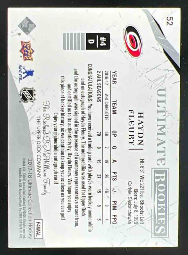 2017-18 Upper Deck Ultimate Collection Patch Autograph Haydn Fleury Auto /49