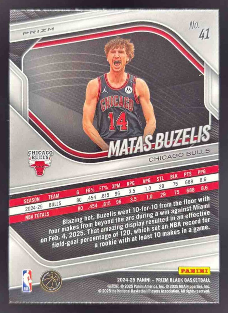 2024-25 Panini Prizm Black Hyper Prizms #41 Matas Buzelis RC