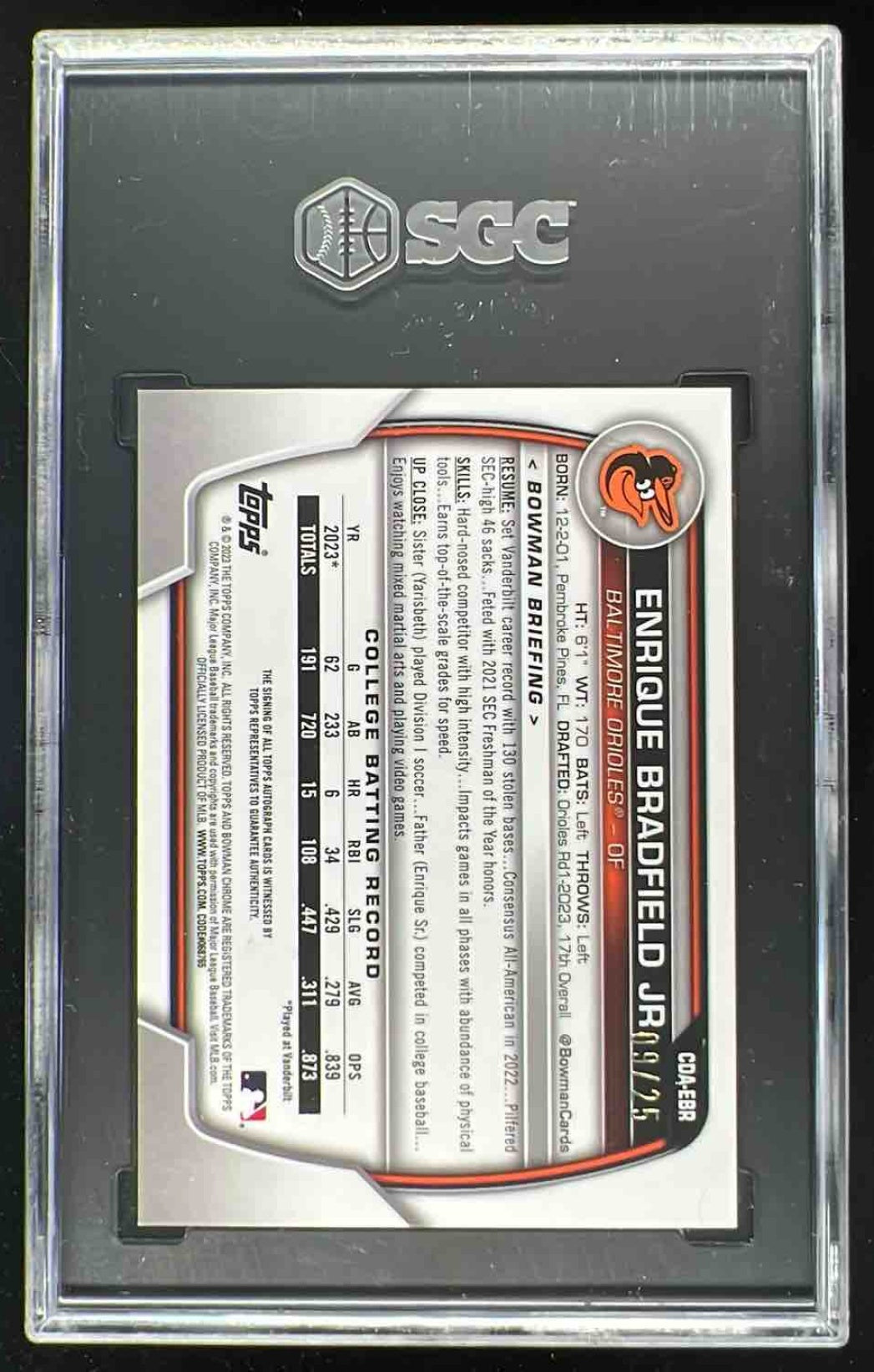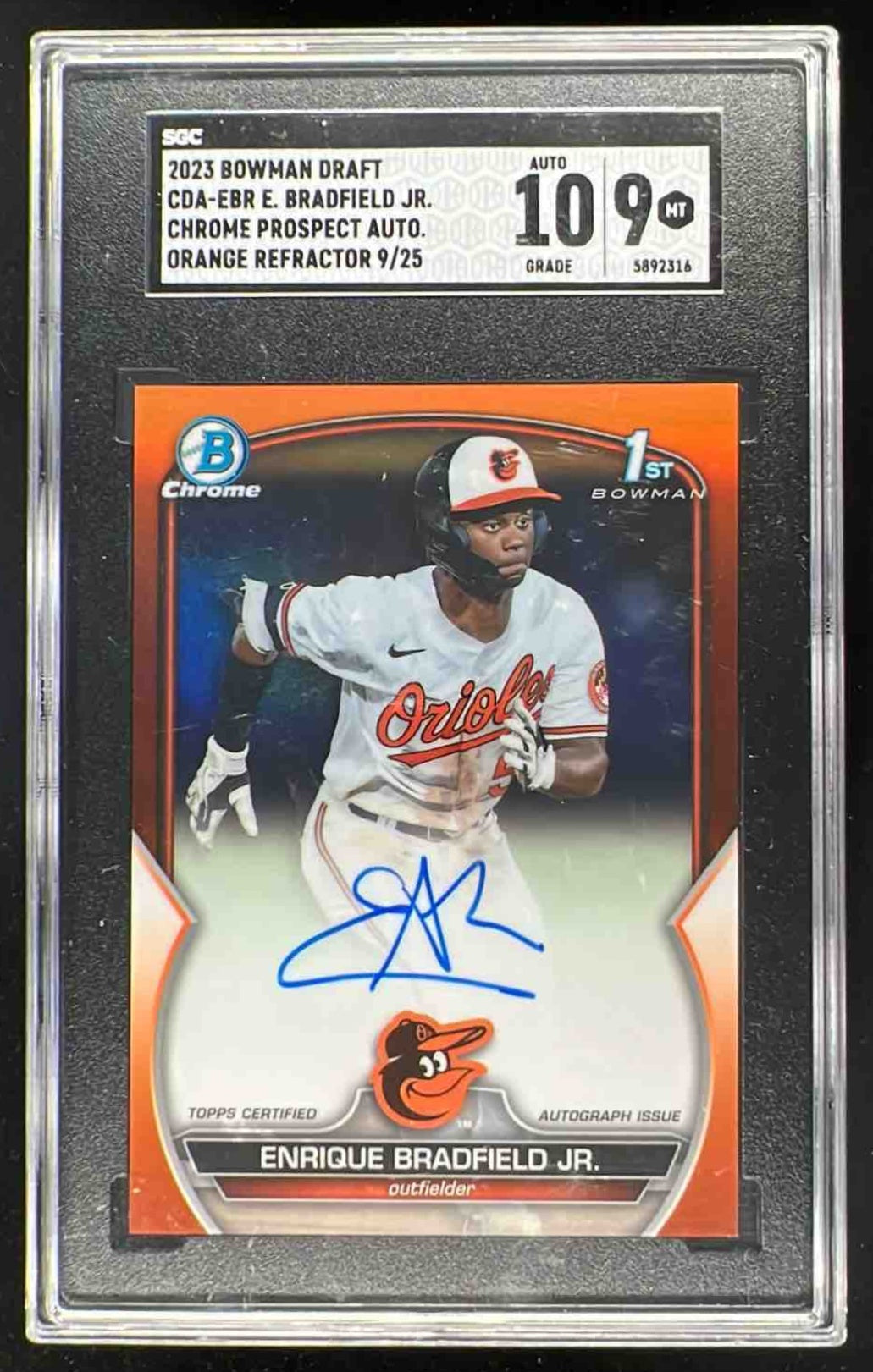 2023 Bowman Draft Chrome Orange Refractor Enrique Bradfield Jr RC Auto /25 SGC 9