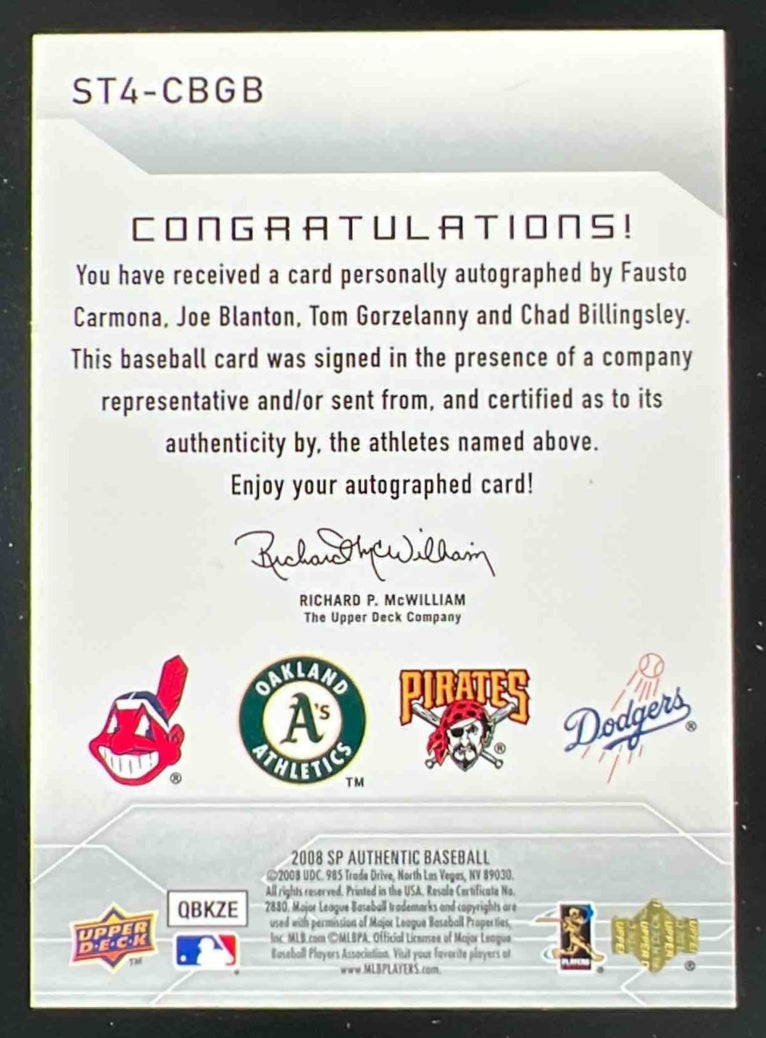 2008 SP Quad Auto Fausto Carmona Joe Blanton Tom Gorzelanny Chad Billingsley /10