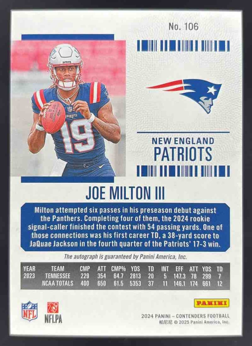 2024 Panini Contenders Rookie Ticket Autographs #106 Joe Milton III RC Auto