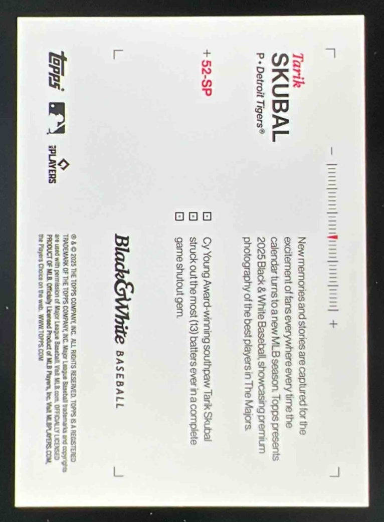 2025 Topps Black and White Image Variations Short Prints #52-SP Tarik Skubal SP