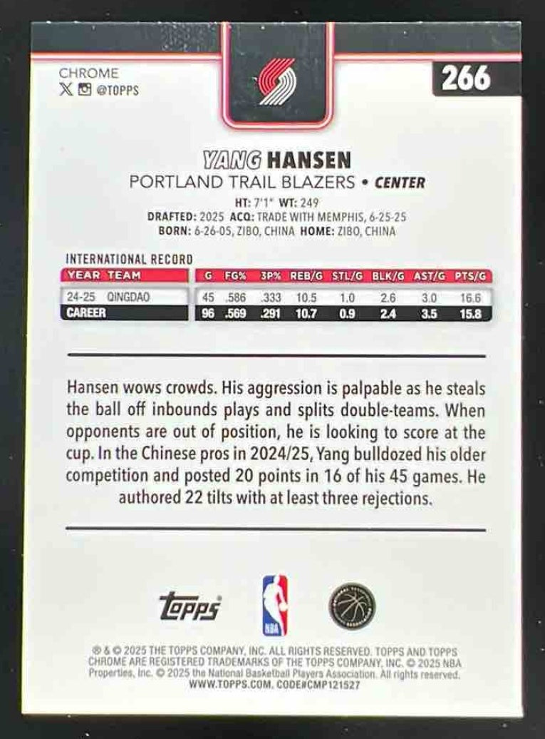 2025-26 Topps Chrome RayWave Aqua Refractor #266 Yang Hansen RC /199