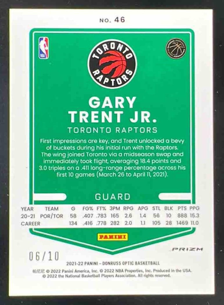 2021-22 Panini Donruss Optic Fast Break Gold Prizm #46 Gary Trent Jr. /10