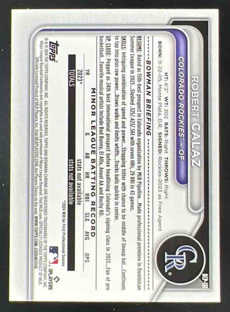 2024 Bowman Chrome Prospects Yellow Refractors #BCP-131 Robert Calaz RC /75