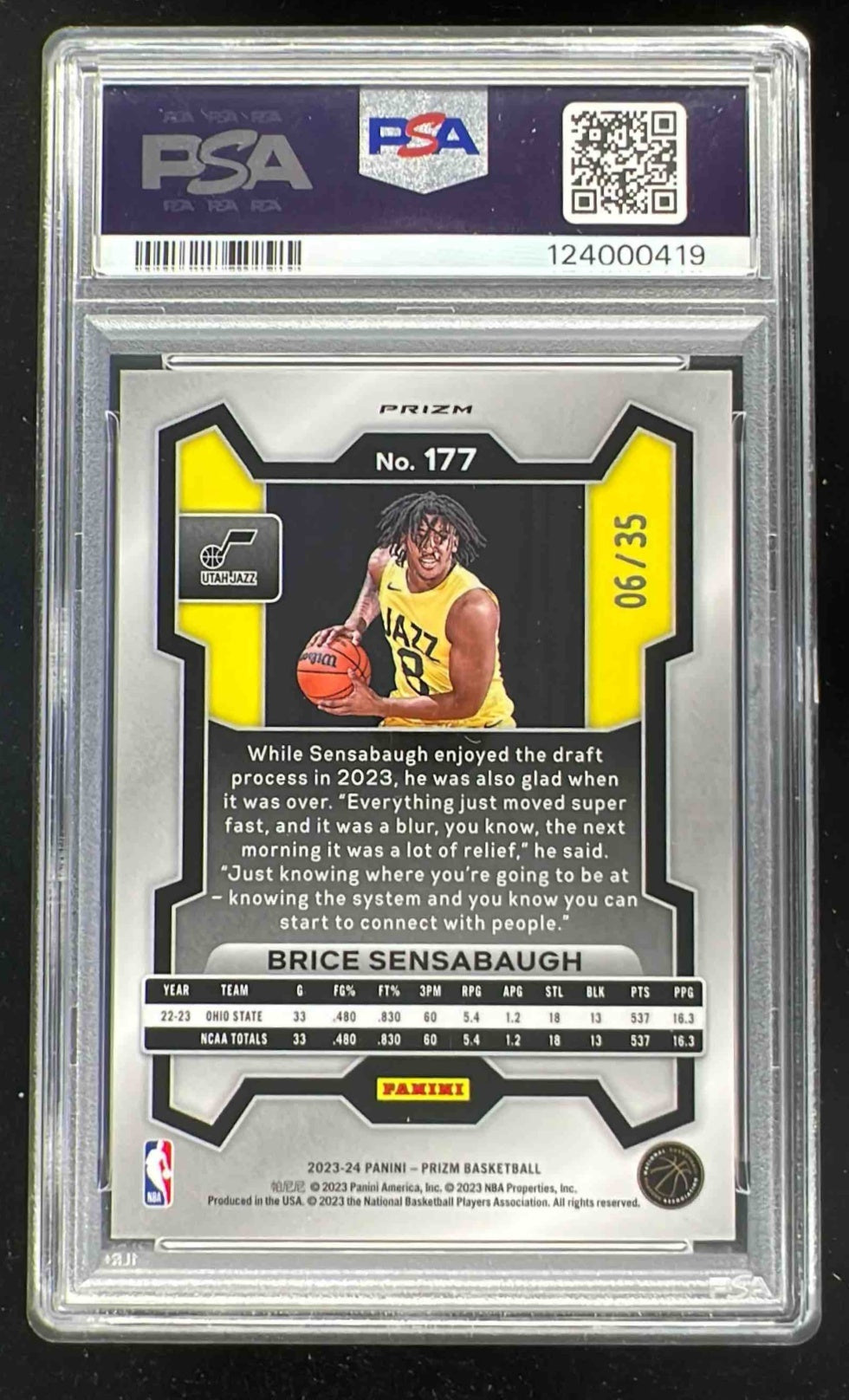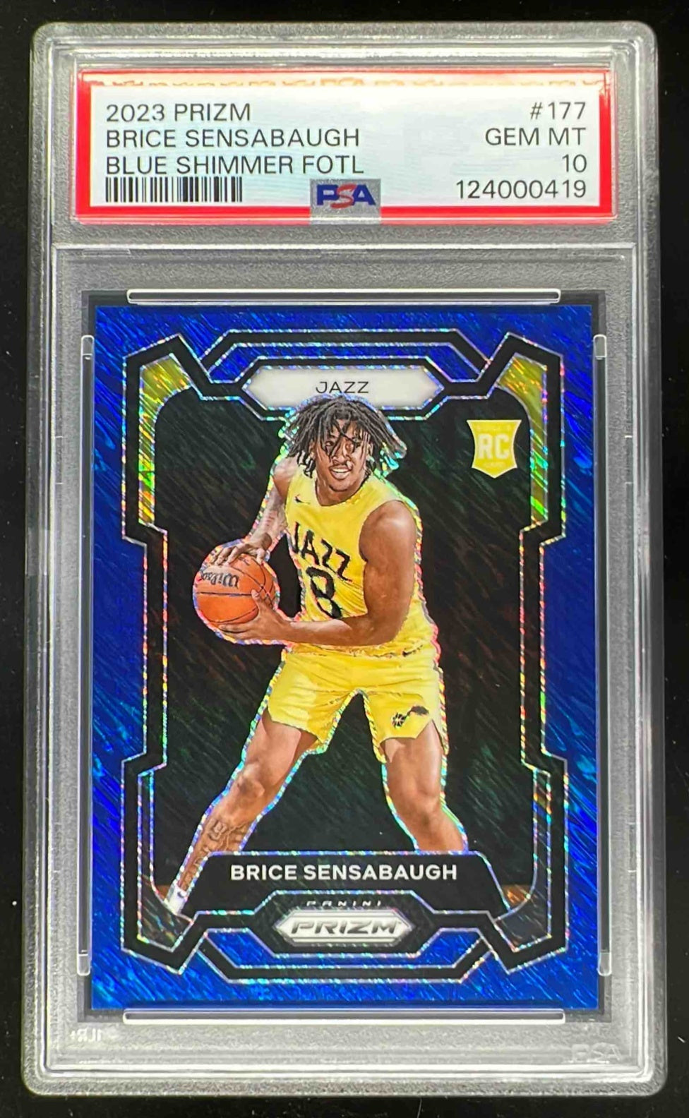 2023 Panini Prizm Prizms Blue Shimmer FOTL #177 Brice Sensabaugh RC /35 PSA 10