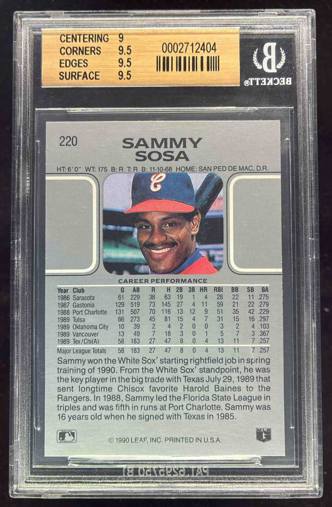 1990 Leaf #220 Sammy Sosa RC BGS 9.5