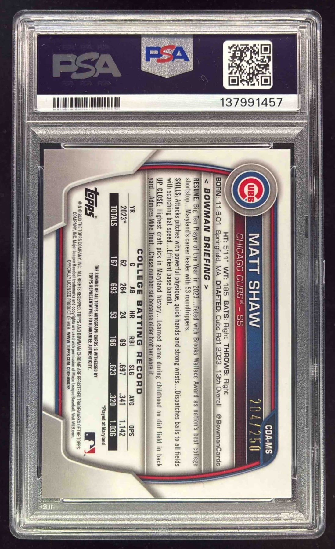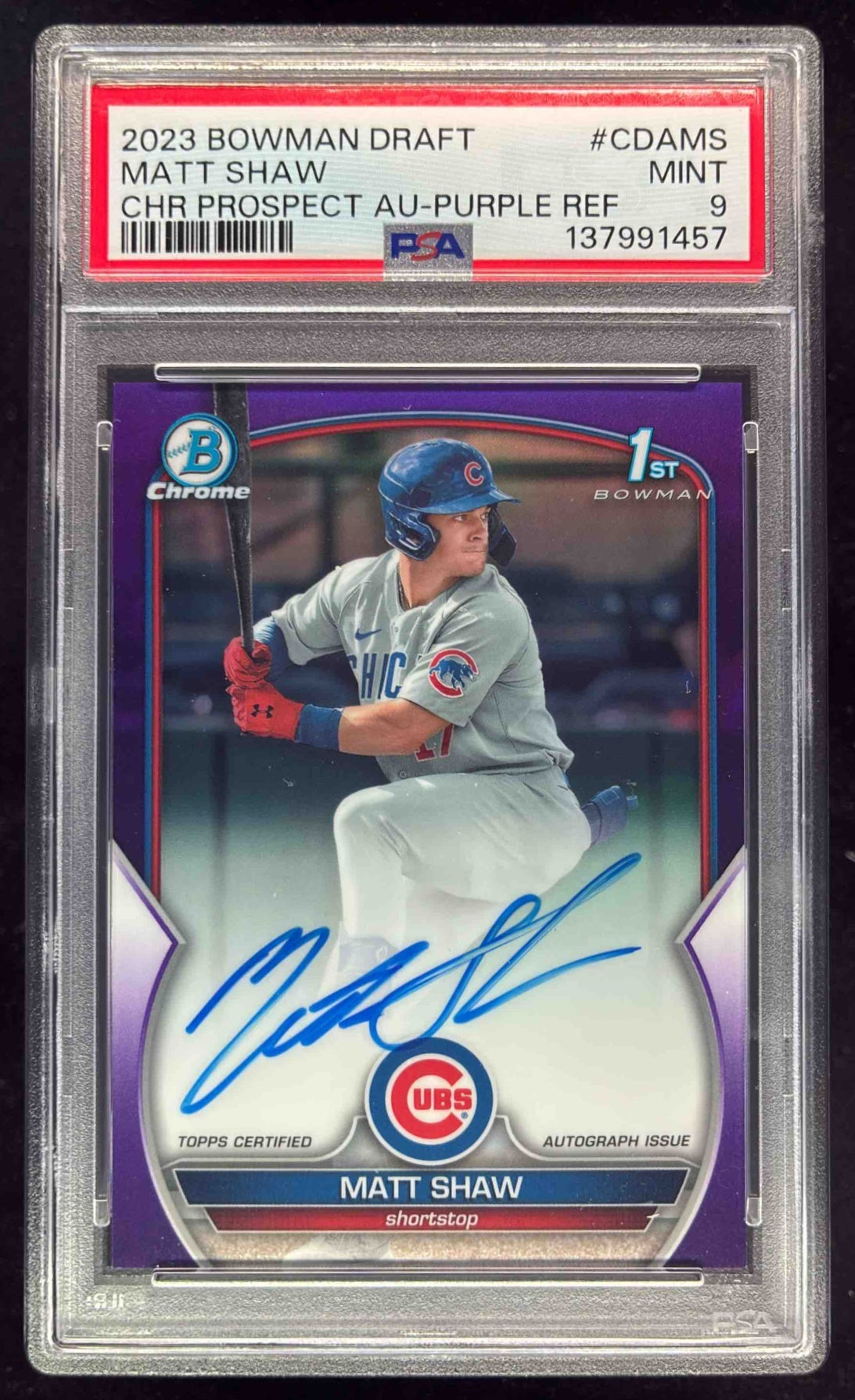 2023 Bowman Draft Chrome Purple Refractor #CDA-MS Matt Shaw RC Auto /250 PSA 9