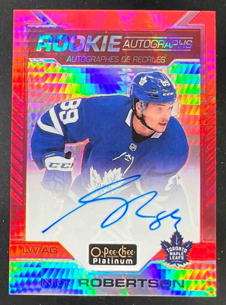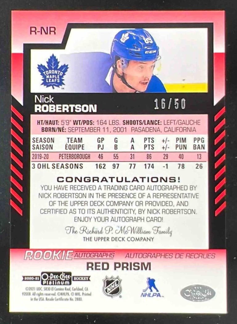 2020-21 O-Pee-Chee Platinum Rookie Red Prism #R-NR Nick Robertson RC Auto /50