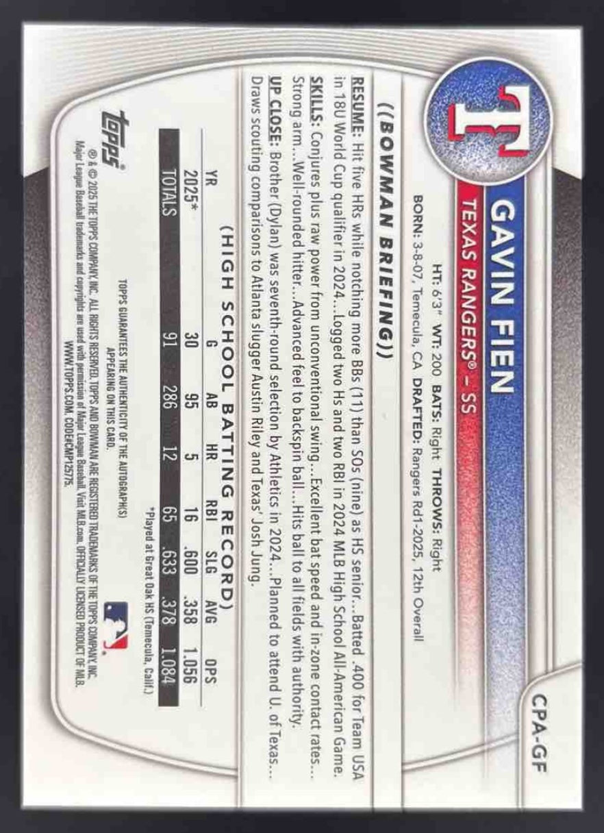 2025 Bowman Draft Chrome Prospect Autograph #CPA-GF Gavin Fien RC Auto
