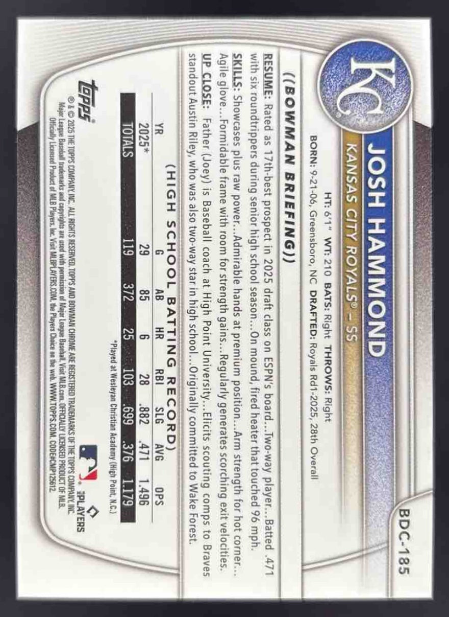 2025 Bowman Draft Chrome Aqua Geometric Refractor #BDC-185 Josh Hammond RC /125
