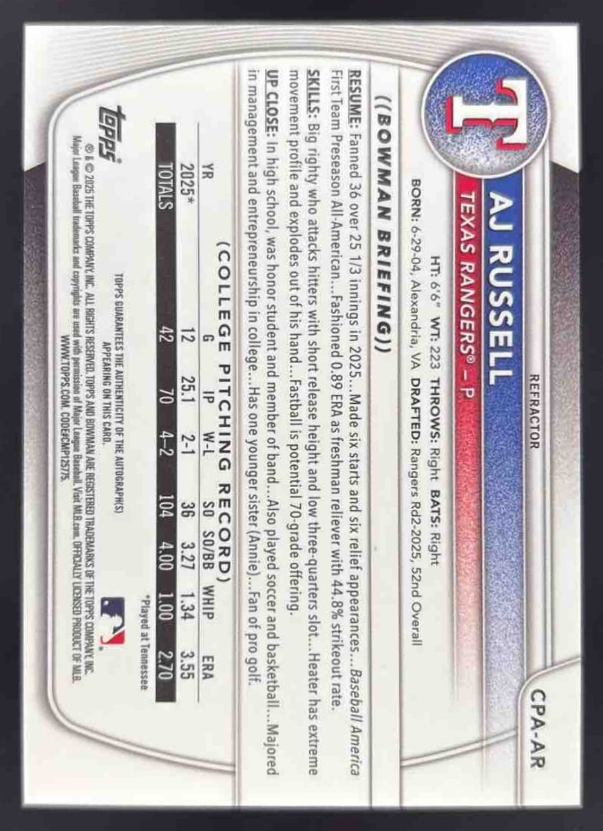 2025 Bowman Chrome Prospect Autograph Refractor #CPA-AR AJ Russell RC Auto /499
