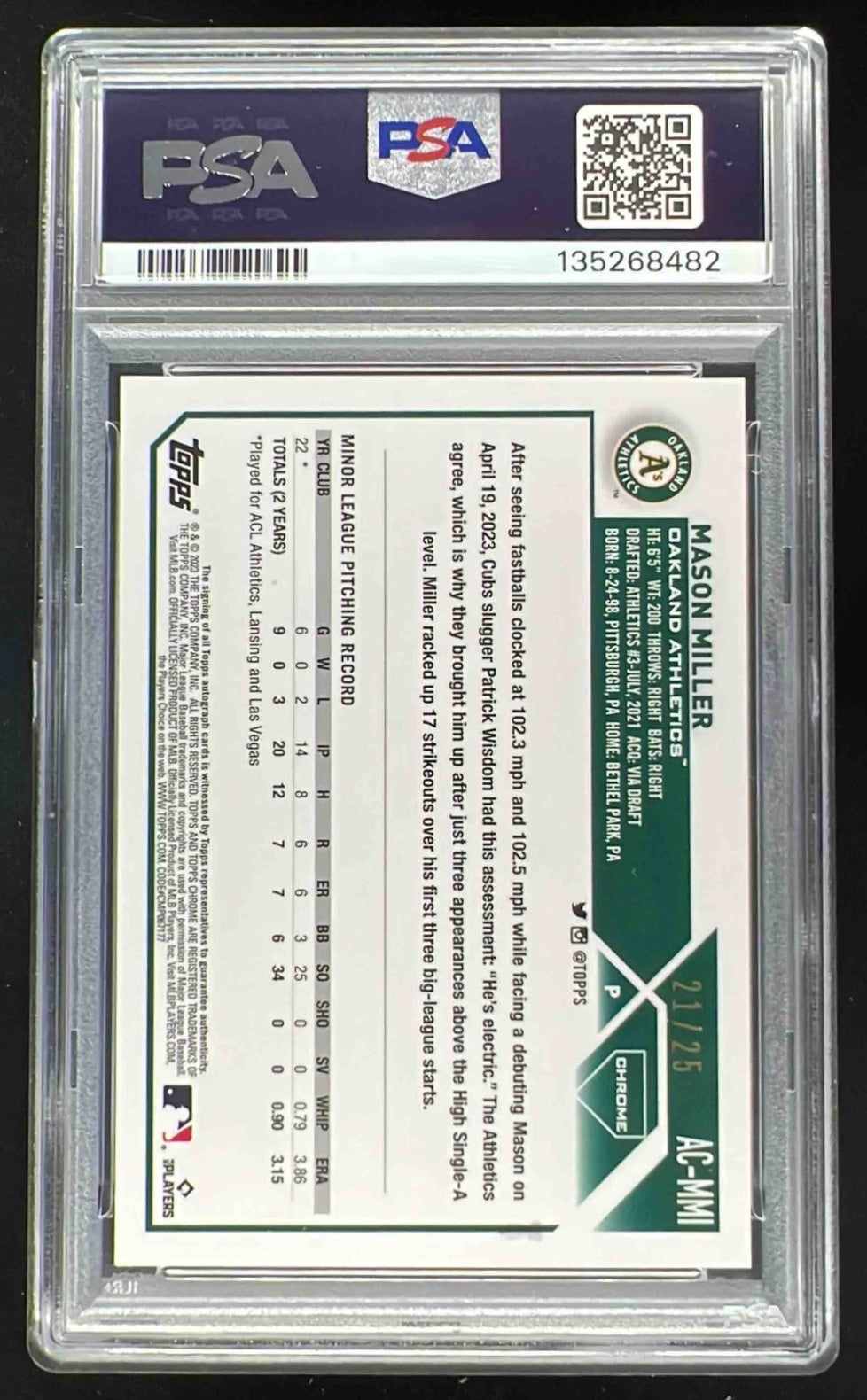 2023 Topps Chrome Orange Wave Refractor #AC-MMI Mason Miller RC Auto /25 PSA 10